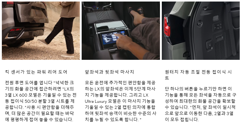 렉서스 LX 700h는 프리미엄 SUV 시장에서 효율성과 럭셔리를 겸비한 모델로, 소비자들에게 매력적인 선택지를 제공합니다. 뛰어난 성능과 연비, 고급스러운 디자인은 물론, 하이브리드 차량으로서의 경제성과 환경친화성까지 갖춘 완벽한 SUV입니다.