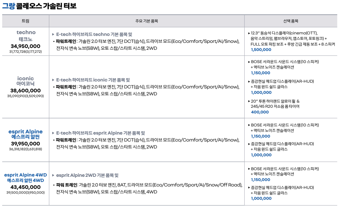 르노 그랑 콜레오스는 하이브리드와 가솔린 두 가지 모델로 구성된 SUV입니다. 각 모델은 사용자의 다양한 필요를 충족시키기 위해 설계되었습니다. 그럼 자세한 내용을 알아보겠습니다.
