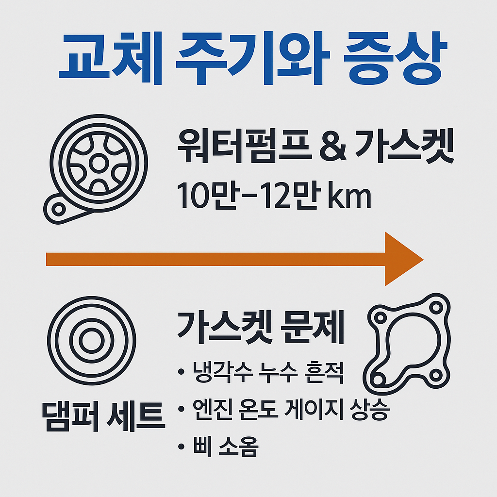 - 교체 주기는 워터펌프·가스켓 10만~12만 km, 댐퍼 세트 12만~15만 km이며, 증상이 나타난다면 즉시 점검이 필요합니다.