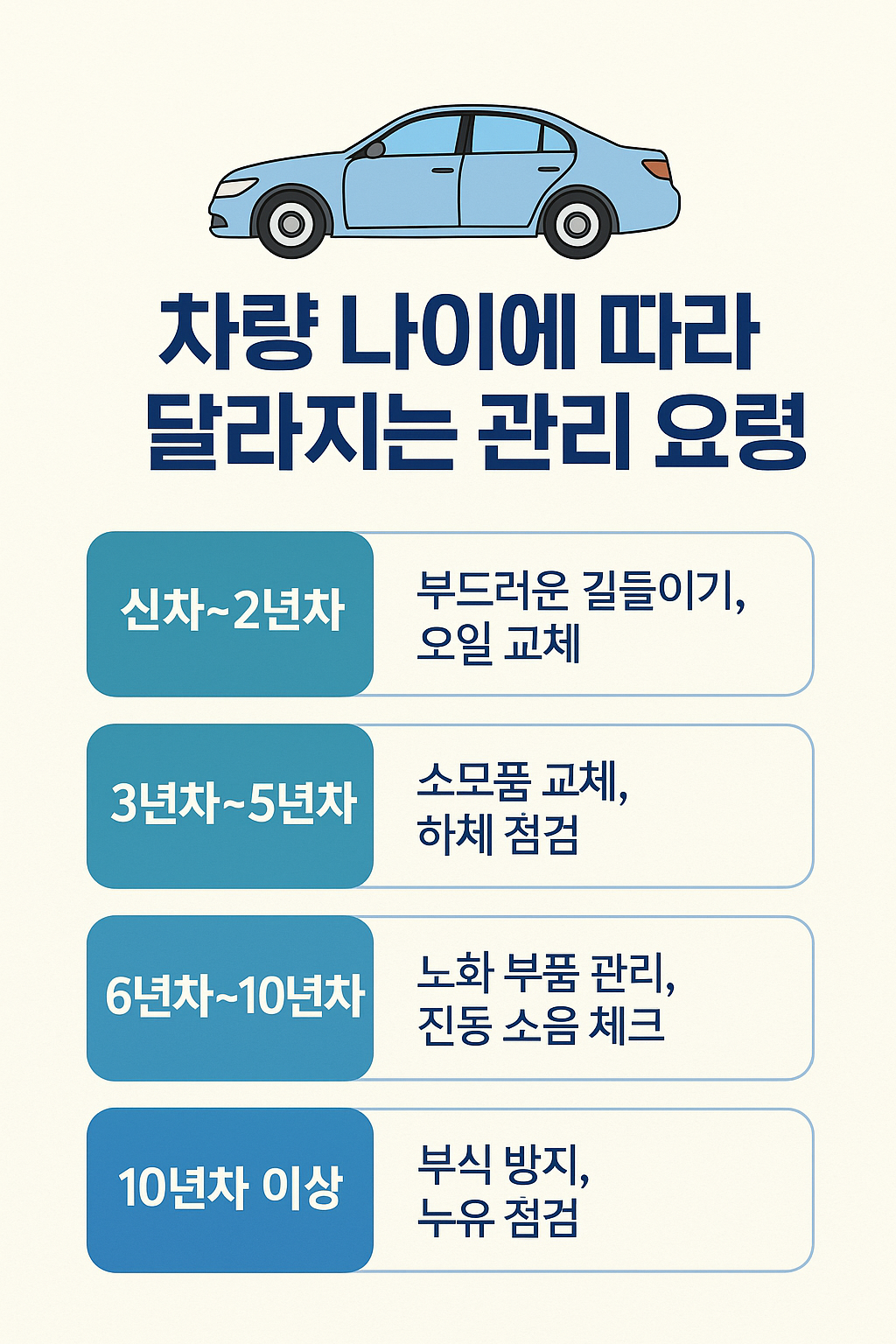 신차는 부드럽게 길들이고, 3년차는 본격적인 소모품 교체, 5년차 이후엔 노화 부품 관리가 중요하죠.