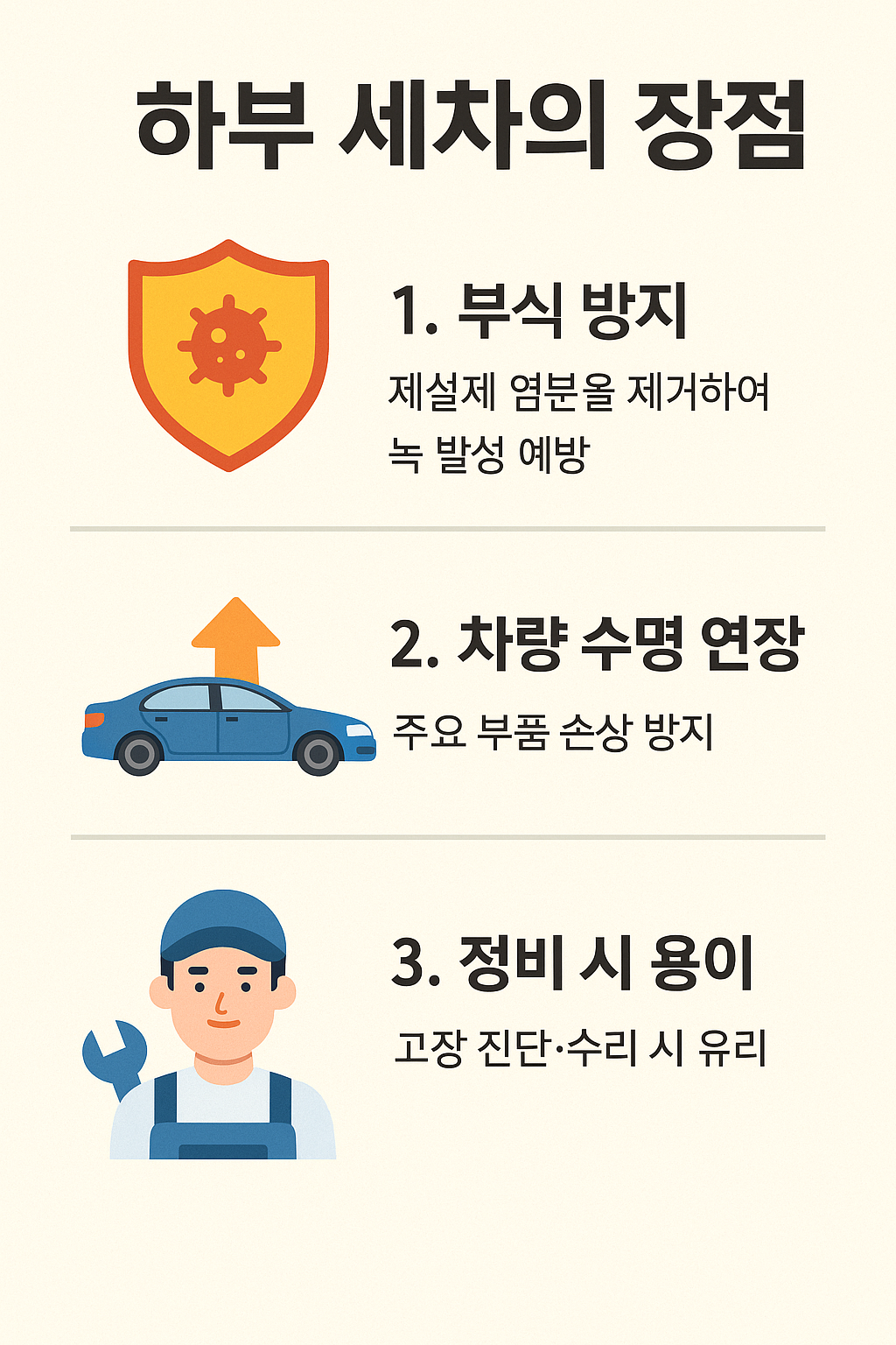 하부 부식은 서스펜션, 머플러, 브레이크 라인 등 주요 부품 손상으로 이어질 수 있어요. 주기적인 하부 세차는 차량 전체 수명에 긍정적인 영향을 줍니다.