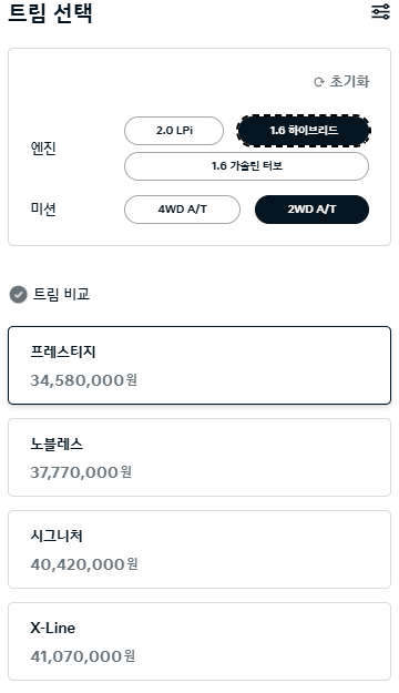 • 풀옵션 모델: 모든 옵션을 추가하면 약 4,300만 원대까지 가격이 상승합니다. 이는 프리미엄 옵션과 효율성을 모두 원하는 소비자들에게 적합한 선택입니다.