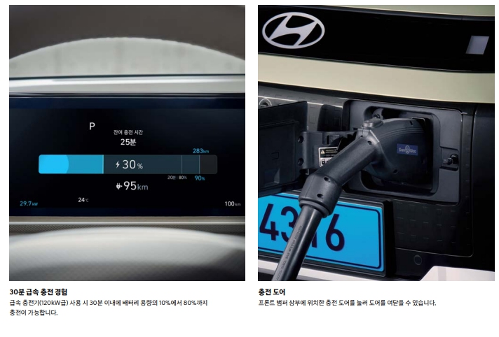 - 충전 속도: 급속 충전 시 약 30분 (10% → 80%)