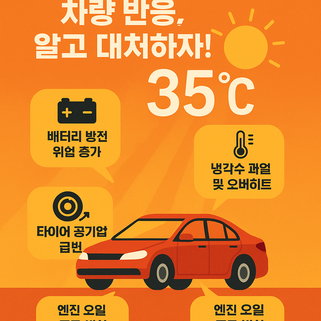 한여름 무더위, 특히 35도 이상의 고온 환경에서는 차량도 사람처럼 '열받을 수' 있습니다. 뜨거운 날씨는 차량 성능에 다양한 영향을 주기 때문에, 예방과 관리가 중요합니다. 이번 글에서는 폭염에서 나타날 수 있는 차량 반응, 문제 예방 방법, 그리고 여름철 차량 점검 포인트를 정리해드리겠습니다.